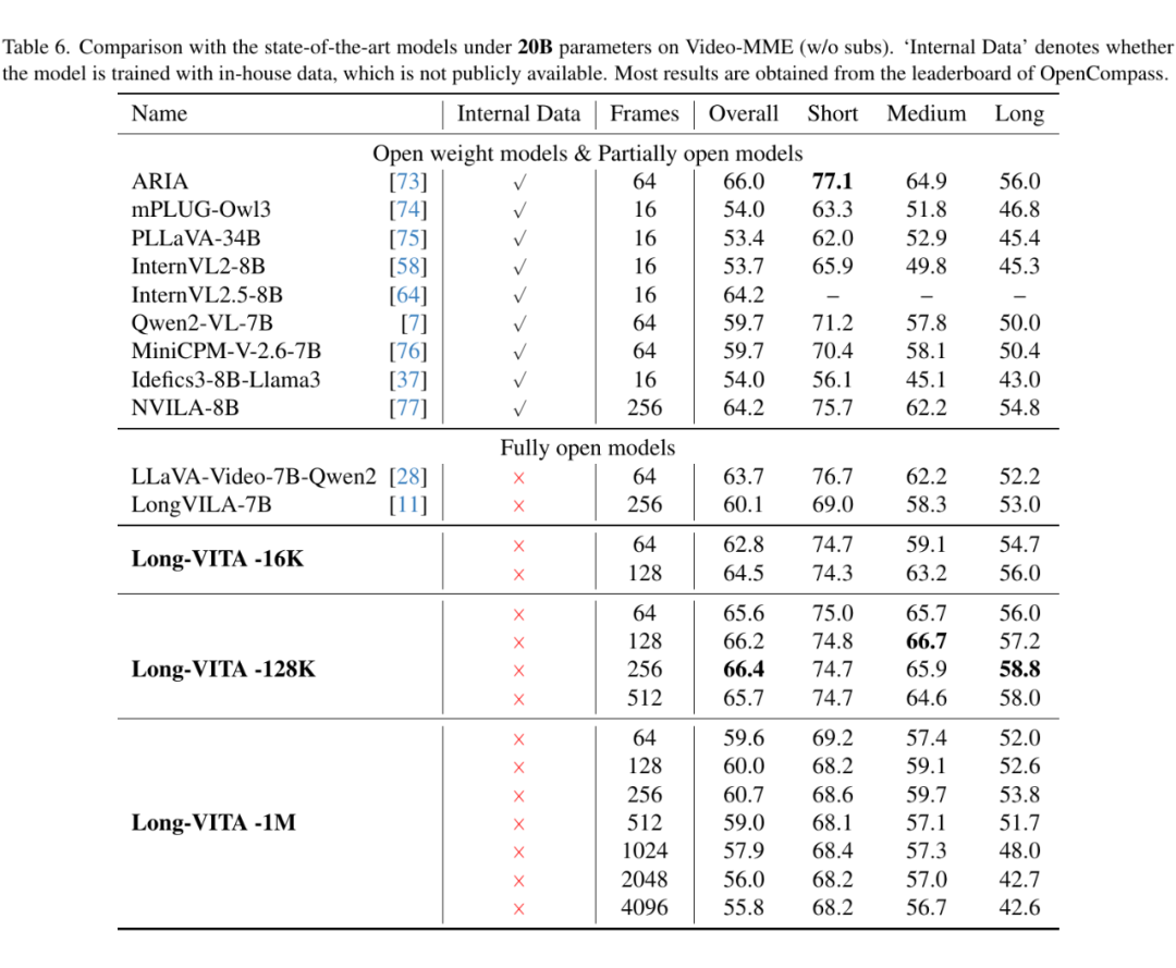 但 Long-VITA-1M 的表现略逊于 Long-VITA-16K 和 Long-VITA-128K,这可能是由于在 1M 训练中未修改 Attention Mask 来隔离样本导致了不同数据样本的混淆。Long-VITA 展示了使用开源数据训练也能实现与私有数据训练相媲美的强大性能。