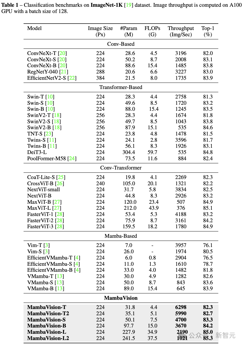 正如图1所示,在ImageNet-1K基准上,MambaVision的Top-1准确率和图像处理能力达到了新的Pareto最优点,超越了Mamba、CNN和ViT基于的模型,有时差距非常显著。