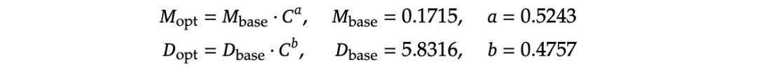 缩放定律: 通过实验建模了计算预算C与最佳批量大小和学习率之间的幂律关系,公式如下: