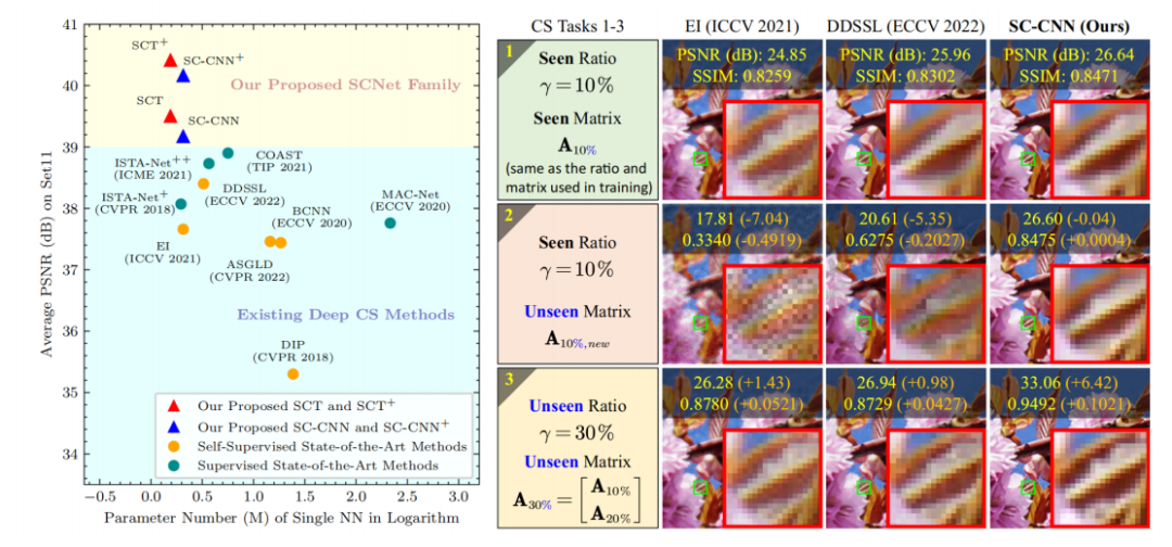 得益于提出的双域自监督损失函数与基于协同表示的重建网络,我们的方法在多个测试集(Set11、CBSD68、Urban100、DIV2K、我们构建的数据集)、多种数据类型(模拟/真实数据、1D/2D/3D数据)以及多个任务(稀疏信号恢复、自然图像压缩感知、单像素显微荧光计算成像)上均表现出优异的重建效果。同时,我们的方法展现出了对训练时未见过的采样矩阵与采样率的出色泛化能力。