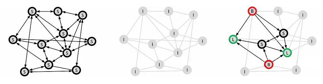 定向: 节点可以采取的动作结果相当于输入图的一种特殊形式的“定向重连”。例如一条边可以被删除(两个邻居都倾听但不广播);保持无向边(两个邻居都倾听和广播);或者变成一条有向边(一个邻居倾听同时另一个邻居广播)。