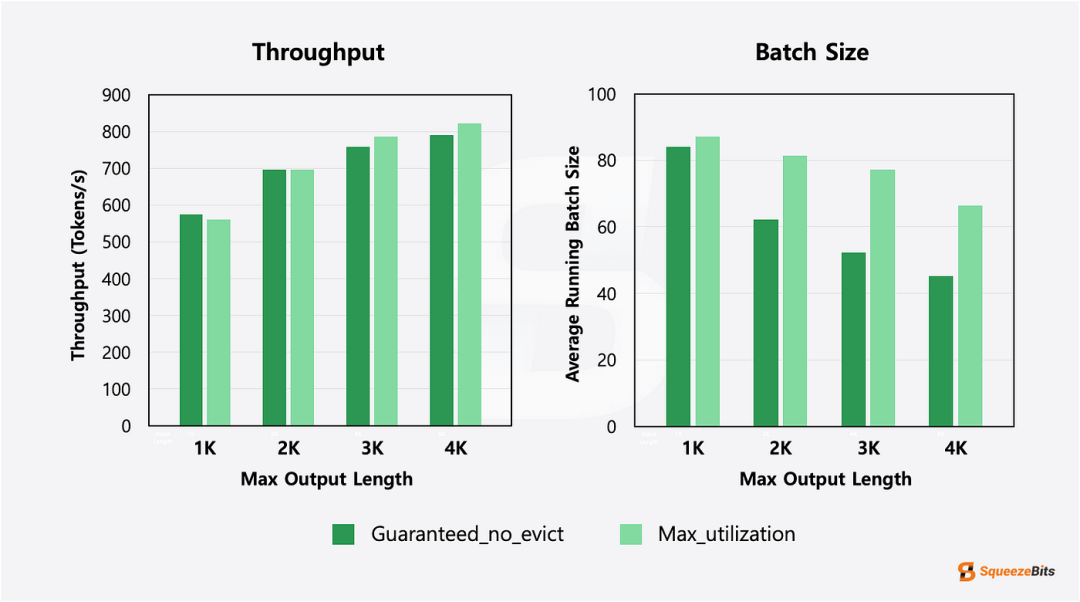 图 5 展示了不同策略的吞吐量和平均运行批量大小。当最大输出长度为 1K 时,GUARANTEED_NO_EVICT 的吞吐量略高。此时,两种策略的平均批量大小相似,因为 GUARANTEED_NO_EVICT 分配的 KV 缓存能够支持请求直到生成提前终止。此外,MAX_UTILIZATION 可能因其复杂的调度功能(如非连续的 KV 缓存分配)带来额外的延迟开销,因此吞吐量略低于更简单的 GUARANTEED_NO_EVICT 策略。