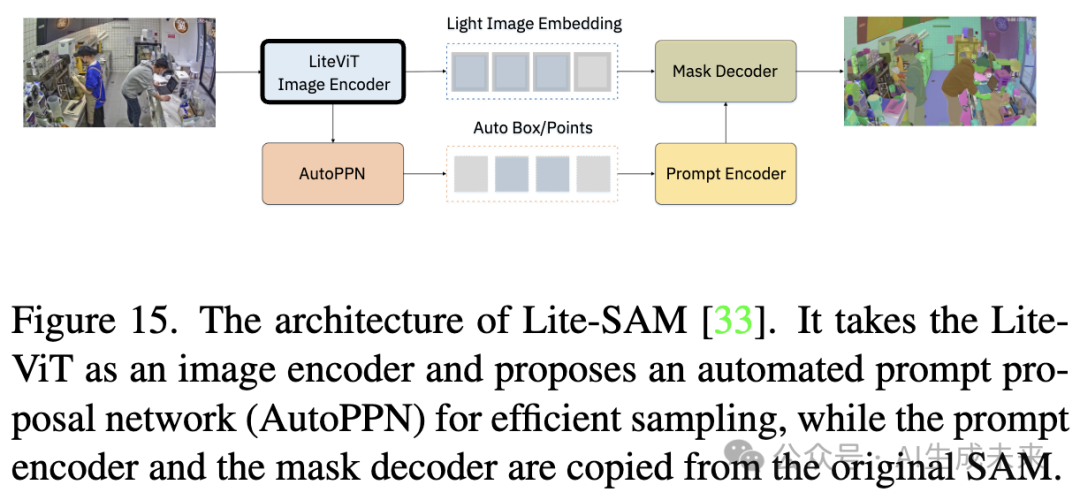 与前述所有工作不同,Fu et al.提出了一个专门为 SegEvery 任务设计的端到端训练管道,旨在开发一个能够更高效地进行全局分割的 SAM 变体。他们的模型名为 Lite-SAM,保留了原始 SAM 的整体架构,但用更轻量化的解决方案替换了重型图像编码器。Lite-SAM 的架构概述如下图 15 所示。
