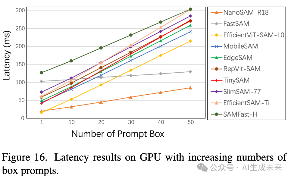 通过曲线图(如下图16所示)报告每10个边界框的累计时间。基于此,计算处理一个图像并使用一个边界框提示所需的平均时间,并将其作为 SegAny 任务的推理时间报告。评估在 CPU 和 GPU 环境下进行,并同时记录 GPU 内存使用情况。此外,还测试了每个变体在 COCO 验证集上的吞吐量,使用真实的边界框。
