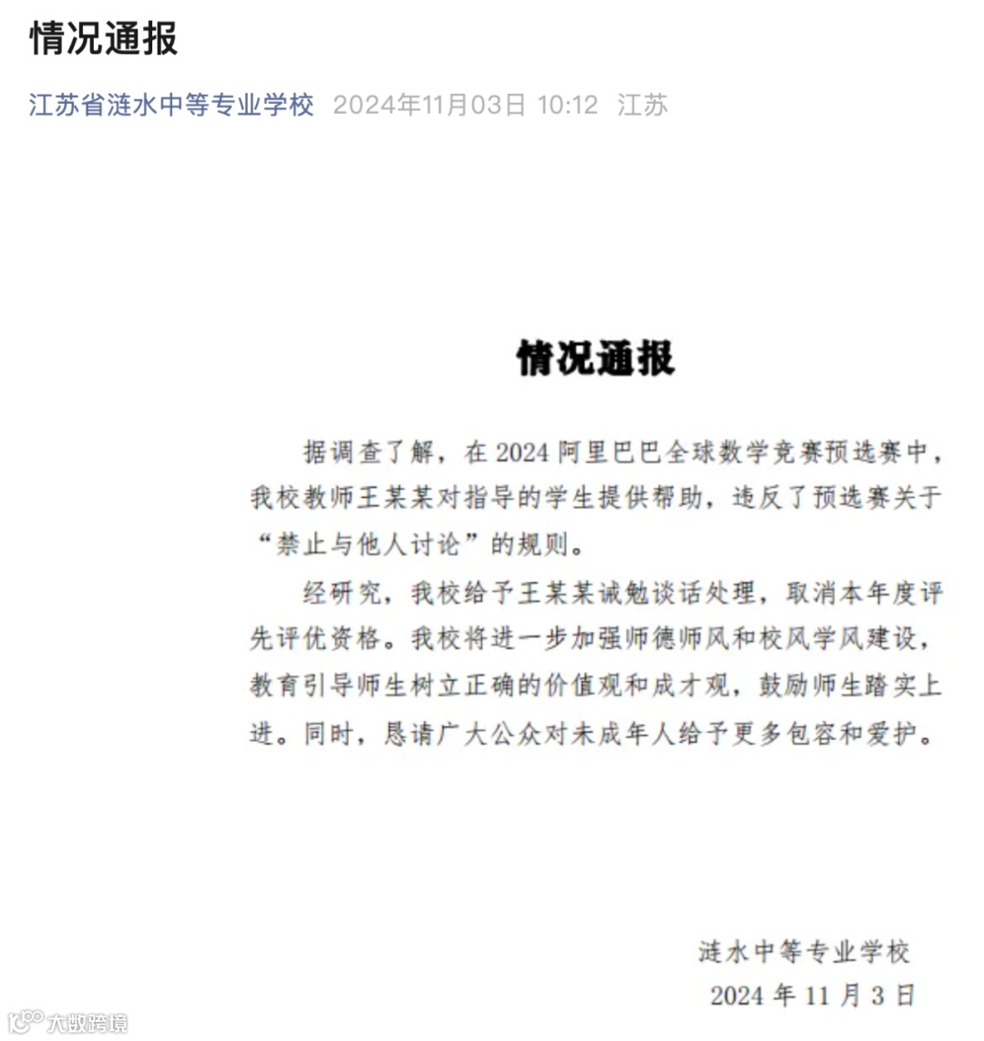 在《2024 阿里巴巴全球数学竞赛有关情况说明》中, 阿里表示,「在本届竞赛中,江苏省涟水中等专业学校教师王某某和其指导的学生入围决赛,引发社会关注。根据决赛阅卷结果,二人未获奖。据调查了解,王某某在预选赛中对其指导的学生提供帮助,违反了预选赛关于 “禁止与他人讨论” 的规则。这也暴露出竞赛赛制不够完善、管理不够严谨等问题。对此,我们表示诚挚的歉意!」