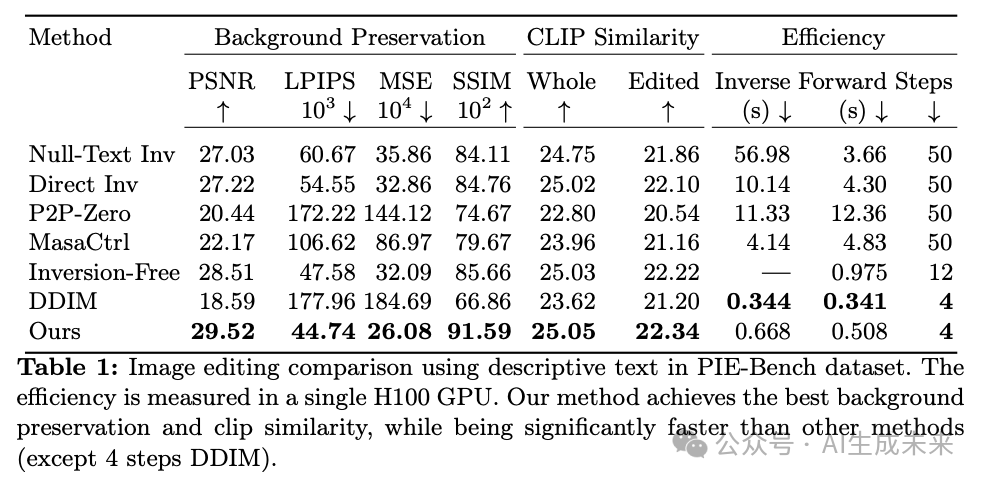 然而,PIE-Bench 数据集仅提供简短的文本提示,而长且详细的文本提示对于确保解耦编辑和防止伪影是必要的。为了在描述性设置中确保公平比较,本文使用数据集中的简短源提示和目标提示,并在第一次采样步骤中冻结注意力图。在指令性设置中,本文使用 LLaVA 生成一个长的源标题,并遵循 PIE-Bench 的简短指令以获得一个长的目标提示,如前文中所讨论。本文的结果显示,与当前的最新方法相比,本文的方法在描述性和指令性设置中都能更好地遵循文本指导并保留背景(见上表 1 和下表 3)。