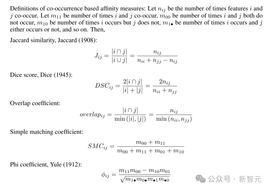 研究者尝试了以下基于共现的亲和度计算方法:简单匹配系数、Jaccard相似度、Dice系数、重叠系数和Phi系数,这些都可以仅通过共现直方图计算得出。
