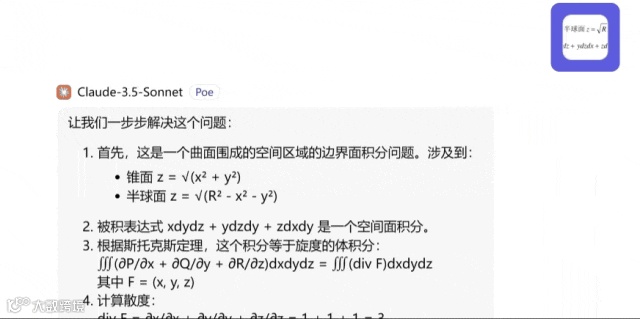 下面进入数学能力测试。比如这道考研数学真题,涉及的知识点是曲面积分、高斯定理等内容: