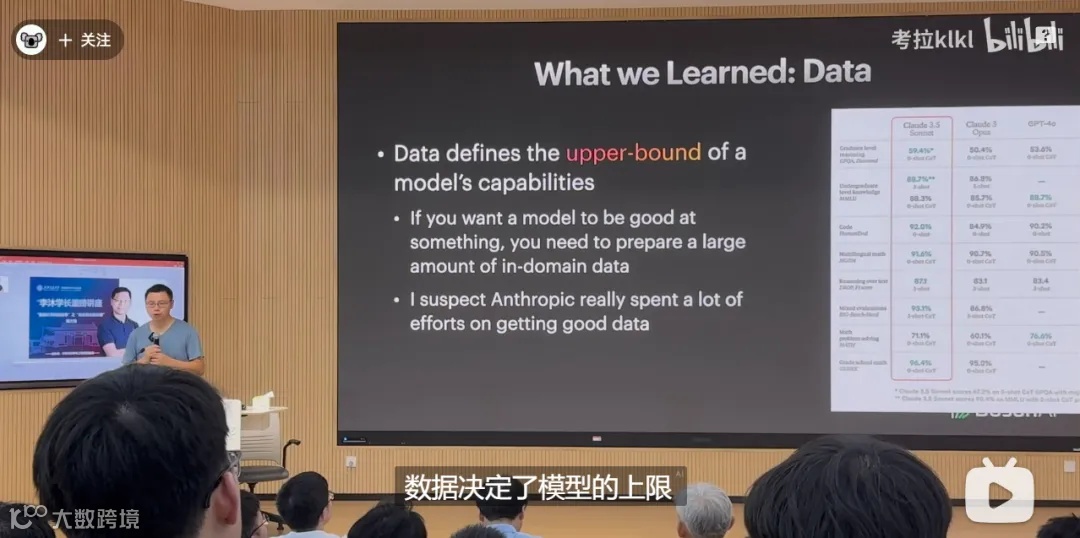 首先第一点:之前大家会觉得预训练很重要,比如训练一个几百 B 参数的模型,现在在我看起来预训练是一个工程问题,后训练才是一个技术问题。但在两年前预训练还是一个技术问题,现在我觉得变成工程问题了。对于后训练,高质量的数据和改进的算法能够极大地提升模型效果。高质量的数据一定是结构化的,并且与应用场景高度相关,以保证数据的多样性和实用性。