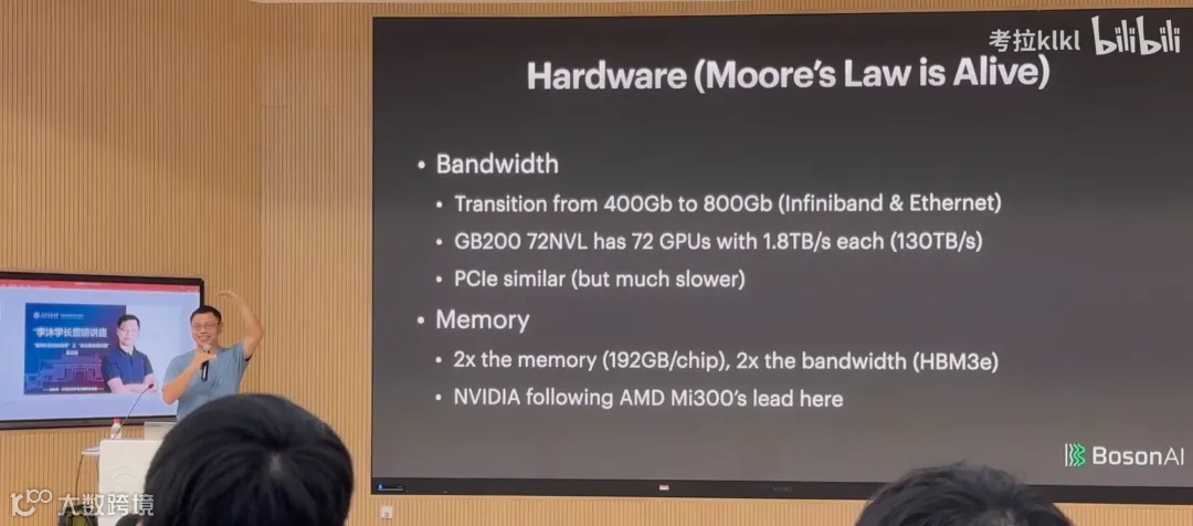 硬件这块,我放第一位的是带宽。实际上带宽是最难也是最重要的。因为就现在的模型训练而言,很难让一个机器搞定所有事情,所以要做分布式训练,通常瓶颈就在带宽上。