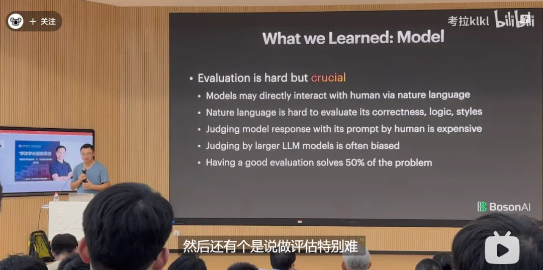 还有就是做评估特别难,模型在实际场景中的应用是一件非常复杂的事情,假如你用一个比较简单的评估,是无法评估模型的好坏。所以过去一年多,大家都在不停的刷新榜单,但实际用起来,就觉得模型不太行,因为评估没有到位,没有真的去把实际场景那么复杂的应用给评估进去。