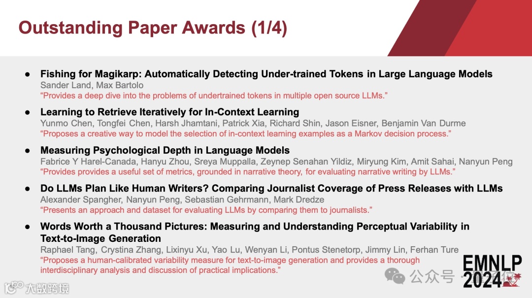 此次共有5项研究成果获得EMNLP’24最佳论文奖。