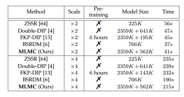 在模型大小(参数数量)、运行时间和预训练要求方面,MLMC具有与其他方法相似的模型大小,并且具有有竞争力的运行时间。所有模拟过程均由 GeForce RTX 3090 GPU 加速,输入 LR 图像的大小为 256×256,比例因子 s = 2、3、4。MLMC用于生成 1024 × 10 24 大小的 HR 图像的 GPU 大约需要 11GB 内存,接近 Double-DIP(11.2GB)和 DIP-FKP(10.6GB)。这种即插即用的方式和对未知退化的更好灵活性在处理具有真实场景的盲 SR 任务方面具有显著的优势,尤其是那些面对训练数据质量低和复杂模糊的场景,例如太空高速目标(例如卫星、飞机)和医学图像(例如跳动的心脏)。