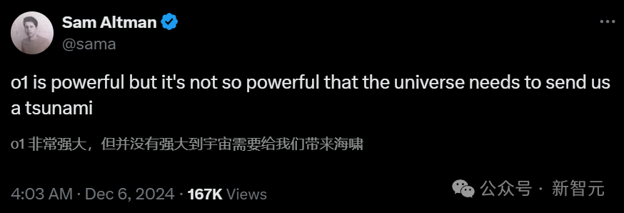 奥特曼幽默风趣地表示,「o1虽强,但还没有强大到宇宙派遣海啸来阻止的程度」。