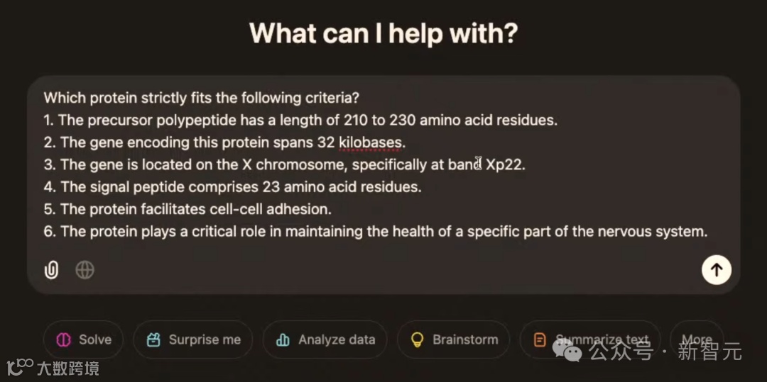 在这个问题中,模型被要求找到一种符合特定标准的蛋白质。挑战就在于,为了满足六个标准,每个都需要模型回忆起高度专业的化学知识。