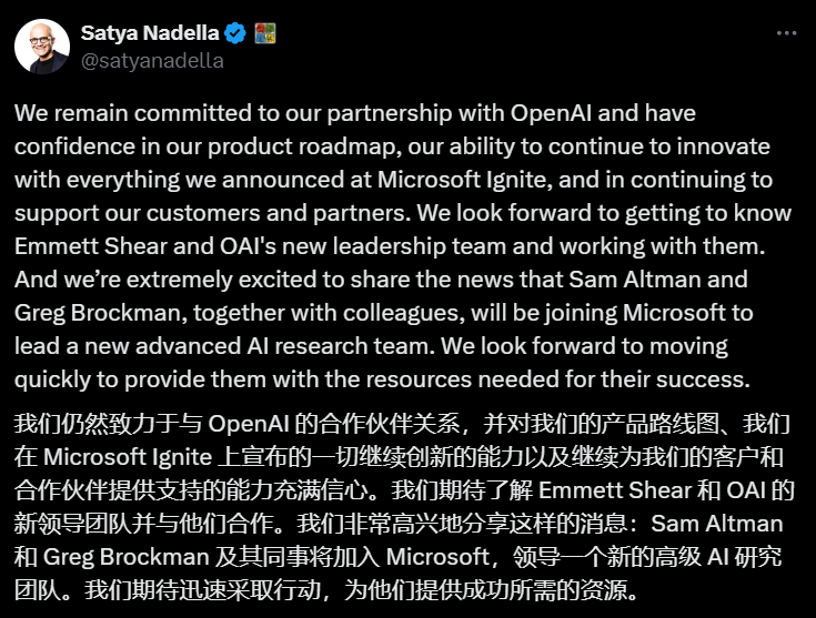 11月20日,微软开始有动作了,其CEO Satya宣布将Altman和Brockman招入微软。