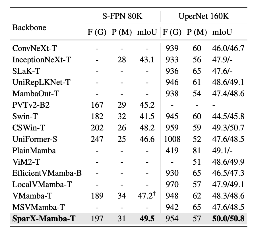 如表 2 所示,对 SparX 在 ADE20K 上也进行了全面的评估,其性能在与一些强大的 Vision Backbones 的比较中脱颖而出,并且有着好的 tradeoff。