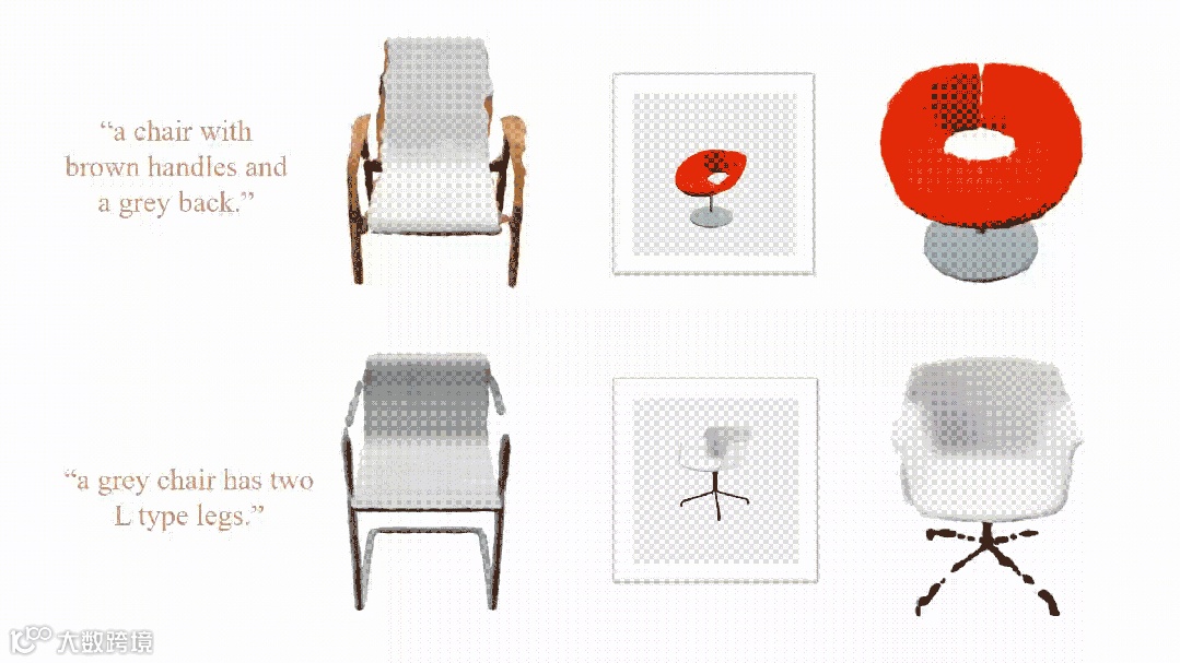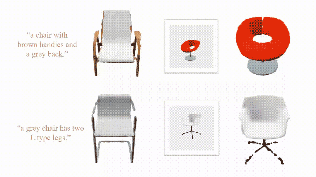 给定文本,比如“a grey chair has two L type legs”, DiffGS能够生成对应的三维高斯模型