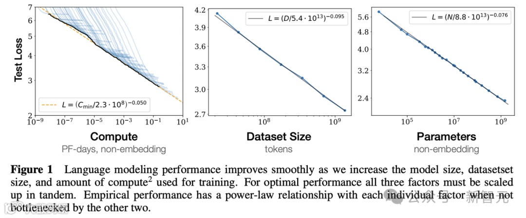 OpenAI团队2020年提交的arXiv论文中最先提出这一概念:LLM性能与计算量、参数量、数据量三者呈现幂律关系