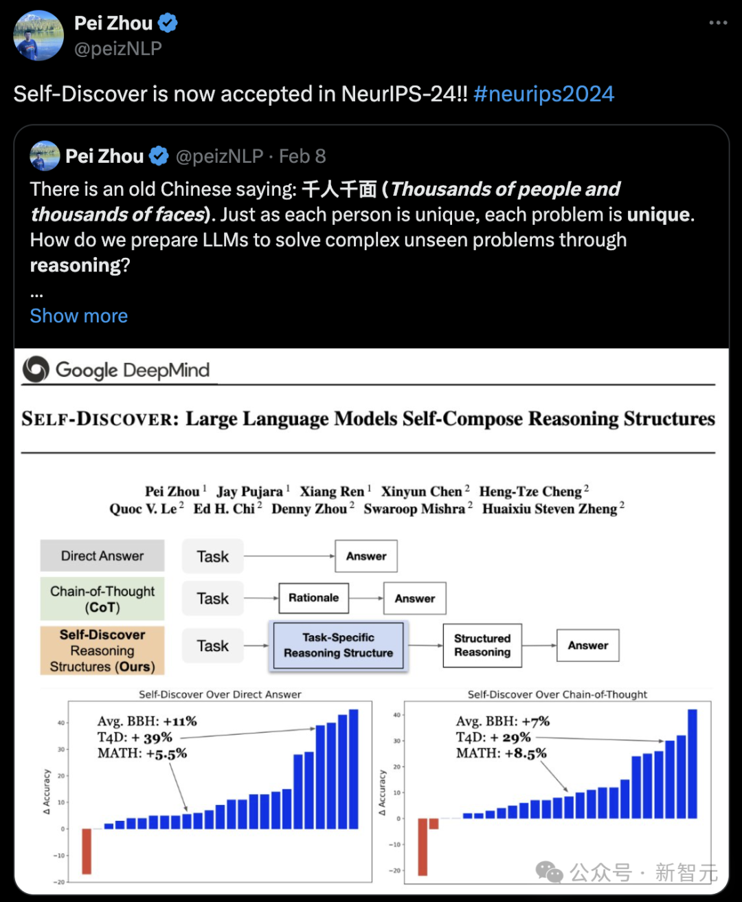 谷歌DeepMind团队Self-Discover算法被NeurIPS 2024录用。