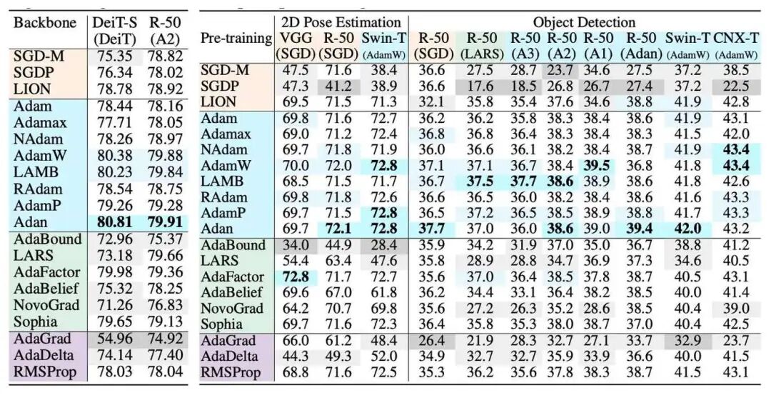 过去十年中,深度学习在各类计算机视觉任务上取得了显著突破,这主要归功于网络架构和优化器的快速发展。尽管如此,现有研究往往默认使用固定优化器和超参数配置,很大程度上忽视了选用优化器所带来的影响,缺乏系统性的分析和论证。本文旨在探索骨干网络结构和优化器之间的耦合关系,评估并探索这种关系对模型性能、模型参数特征和迁移性的影响和规律。
