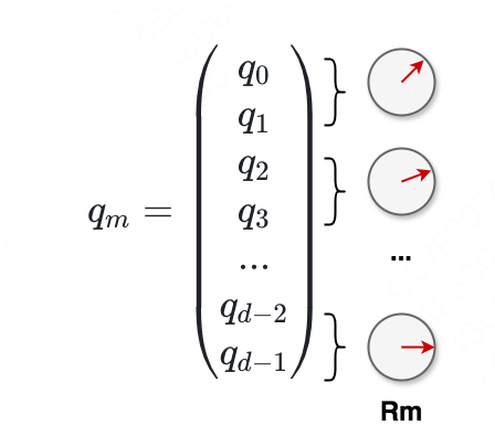 两两为一组 , 每一组都可以看成是一个旋转速度不一样的指针, 我们可以用 个指针来表示 的位置向量, 如下图所示: