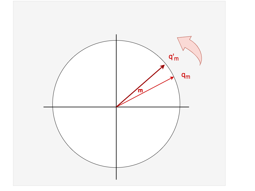 在二维空间中, 这个圆盘表示逆时针方向的旋转, 结合我们学过的极坐标的知识, 它可以被画成一个单位圆, 也就是指针将在这个单位圆上每次做角度为 的逆时针旋转(这就是复数 的几何意义, 理解了这一点, 也能从可视化的角度去看复数推导了, 不理解的话直接忽略)