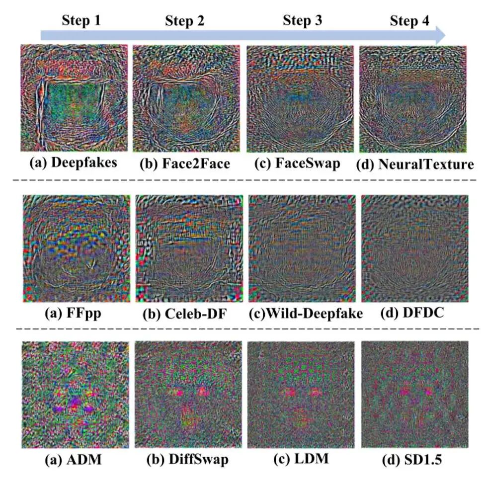 为了更直观地展示HDP框架的效果,研究团队进行了一系列可视化实验。首先,下图展示了不同攻击方法生成的UAP可视化结果。我们可以清晰地看到,不同阶段的UAP呈现出独特的模式,这证实了UAP能够有效捕获各种伪造技术的特征。