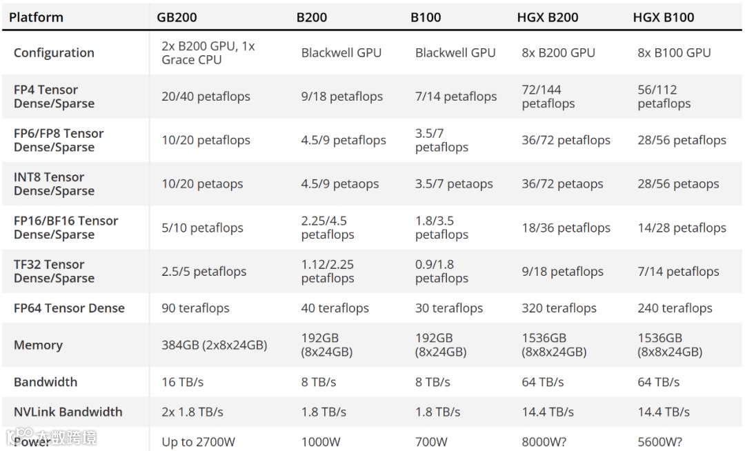 英伟达 Blackwell GPU 不同型号的参数规格。