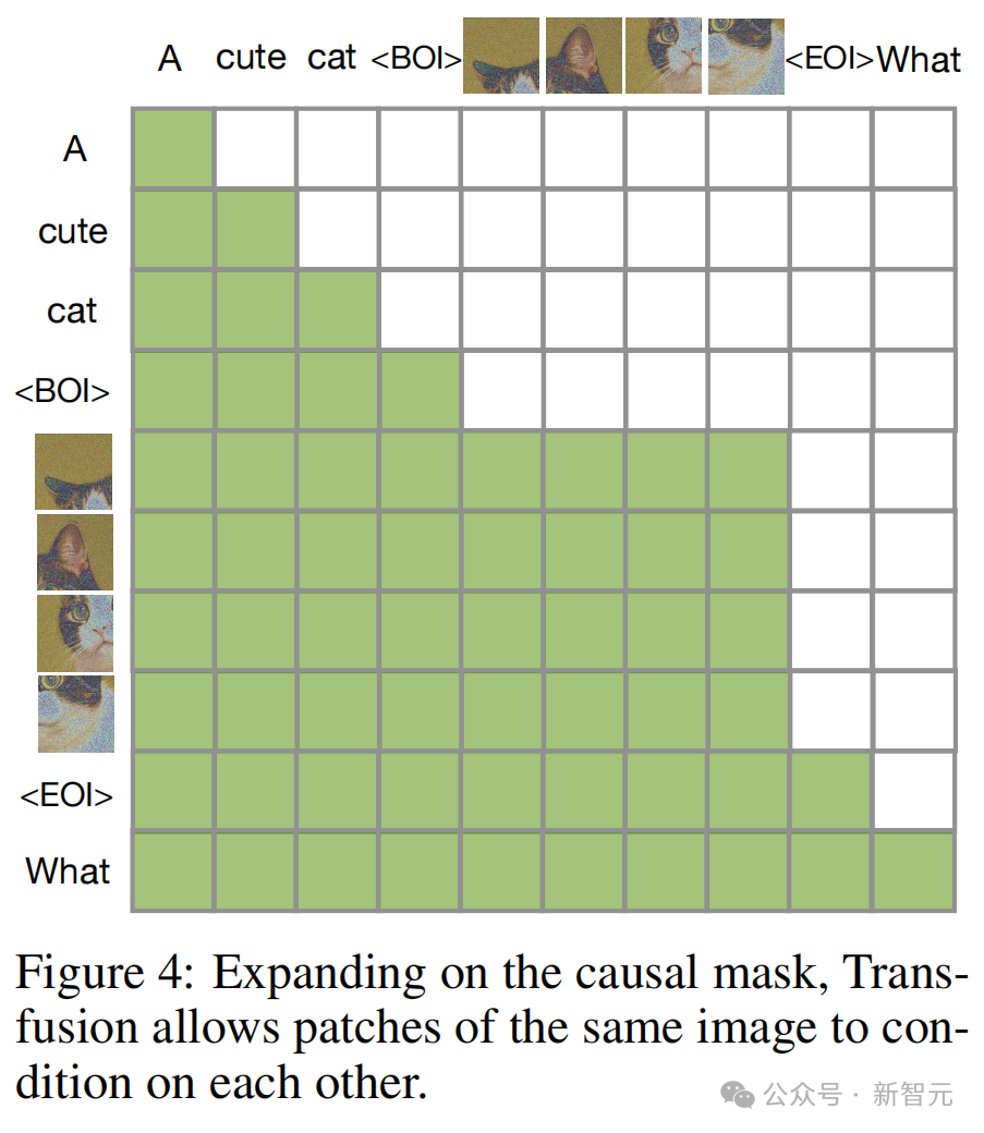 而Transfusion通过对序列中的每个元素应用因果注意力,并在每个单独图像的元素内应用双向注意力,来结合这两种注意力模式。