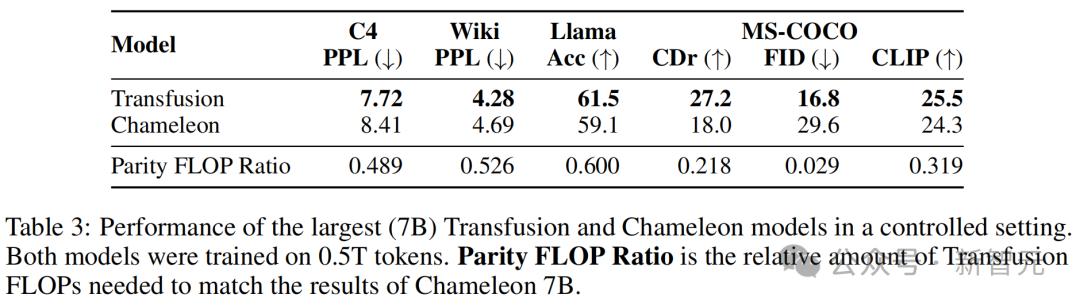 其中,平价FLOP比率用来估算相对计算效率:Transfusion和Chameleon达到相同性能水平所需的FLOPs数量之比。