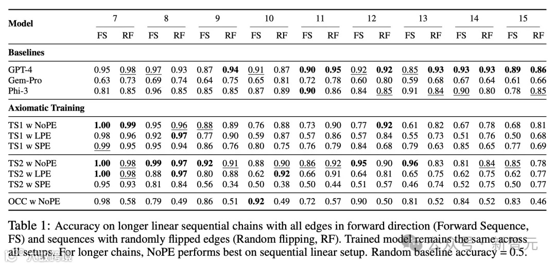 表1展示了不同模型在评估训练过程中,未见过的更长因果链时的准确率。