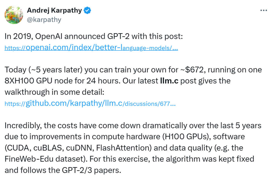 五年后的今天,训练 GPT-2 这样 15 亿参数的大模型,只需要花费 672 美元,在一个 8XH100 的 GPU 节点上跑 24 个小时就可以搞定了。