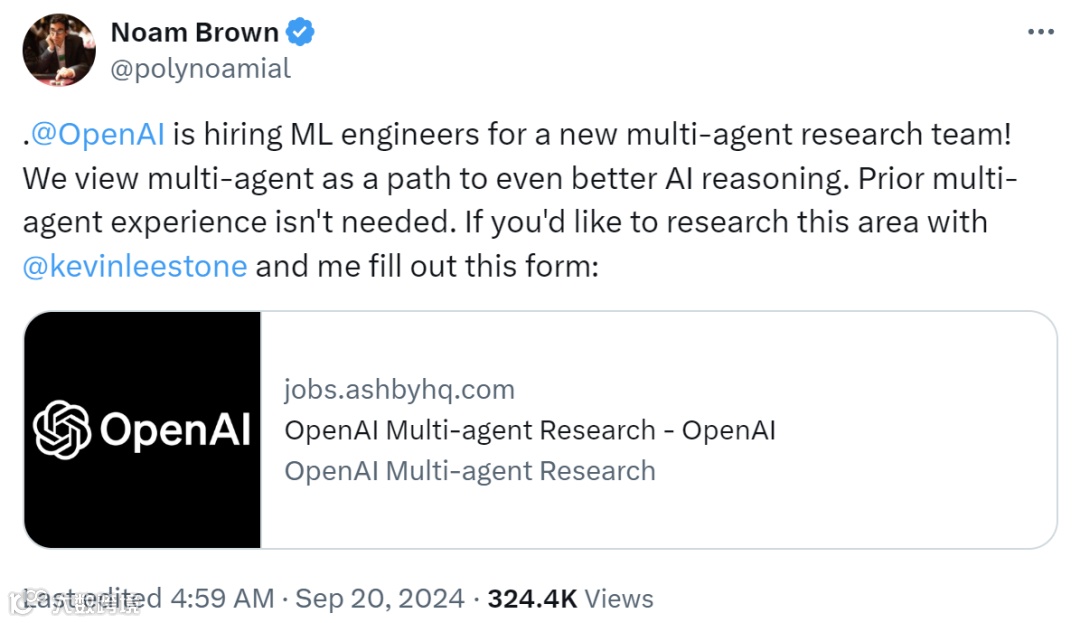 毫无疑问,多智能体肯定是 OpenAI 未来重要的研究方向之一,前些天 OpenAI 著名研究科学家 Noam Brown 还在 X 上为 OpenAI 正在组建的一个新的多智能体研究团队招募机器学习工程师。