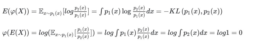 第二项带有负号,其对应的是 的信息熵;第一项也带有负号,代表 和 之间的交叉熵。第一项始终不大于每个给定符号下的第二项,这便是 Gibbs 不等式;而 Gibbs 不等式的证明可以使用 Jensen 不等式: