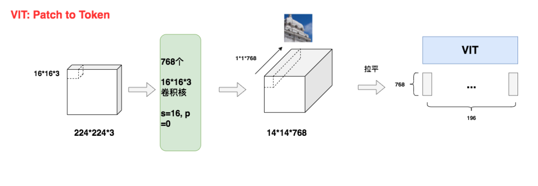 你可能会问,前面不是说VIT已经摆脱CNN了吗?这里怎么又用卷积了?由于这一步只是输入预处理阶段,和主体模型没有关系,只要将其试为一致特征提取方法即可,并不影响我们之前的结论。
