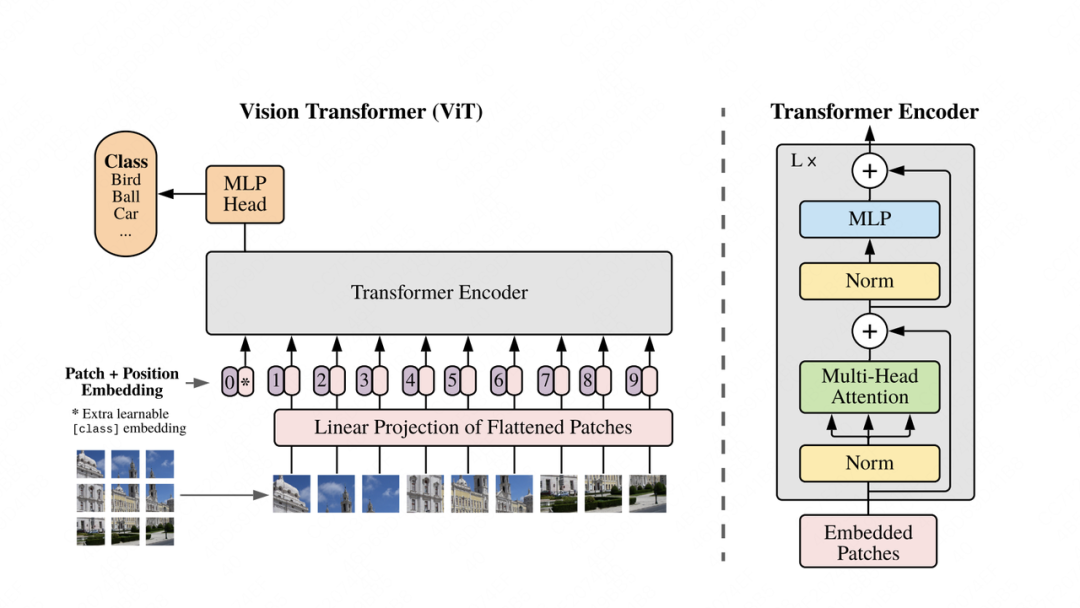 Input: 最终传入模型的Input = patching_emebdding + position embedding,同样,在输入最开始,我们也加一个分类符,在bert中,这个分类符是作为“下一句预测”中的输入,来判断两个句子是否真实相连。在VIT中,这个分类符作为分类任务的输入,来判断原始图片中物体的类别。