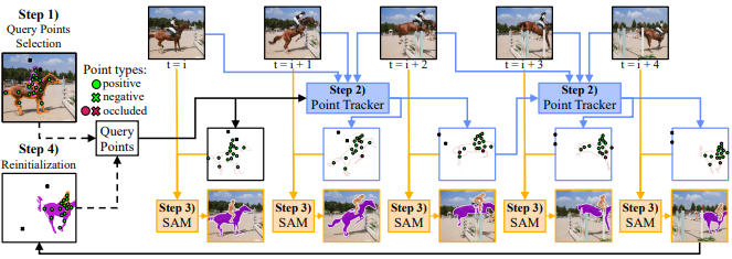 概述:SAM-PT 通过结合 SAM 的稀疏点跟踪来解决视频分割问题。只需要第一帧的稀疏点注释来表示目标对象。强项:在开放世界 UVO 基准测试中展示了对未见对象的泛化能力。操作方式:使用像 PIPS 这样的先进点跟踪器,SAM-PT 为视频分割提供稀疏点轨迹预测。进一步地,为了区分目标对象及其背景,SAM-PT 同时跟踪正点和负点。