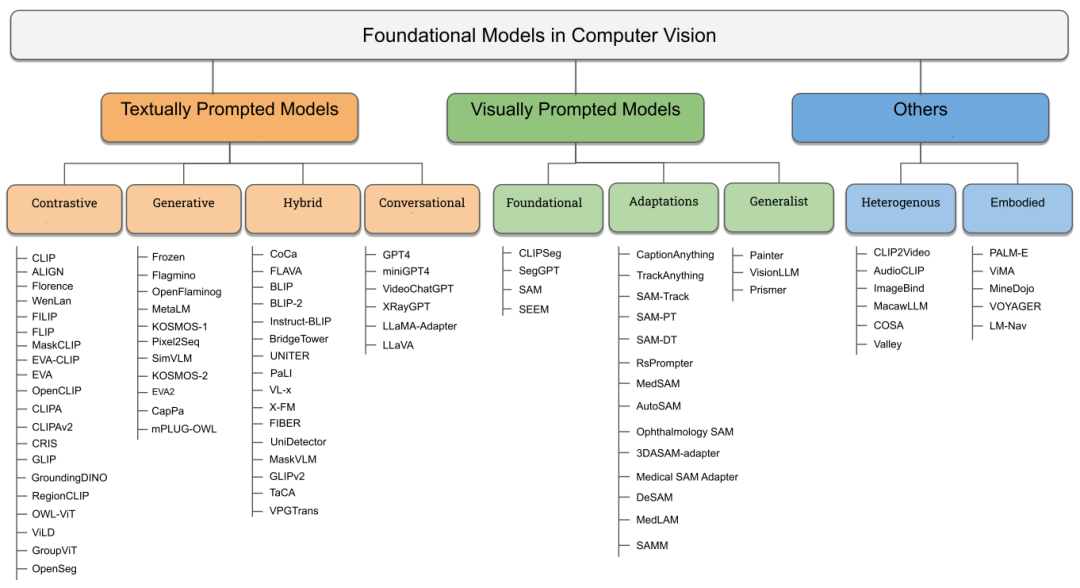 这里我们用 RAM 提取了图像的语义标签,再通过将标签输入到 Grounding-DINO 中进行开放世界检测,最后再通过将检测作为 SAM 的提示分割一切。目前视觉基础大模型可以粗略的归为三类: