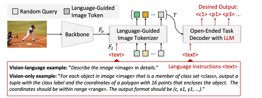 工作方式:给定图像,VisionLLM 使用视觉模型学习图像特征;这些图像特征与例如“详细描述图像”的语言指令一起传递给语言引导的图像分词器。任务解码器:图像分词器的输出连同语言指令被提供给一个开放式 LLM 为基础的任务解码器,旨在根据语言指令协调各种任务。