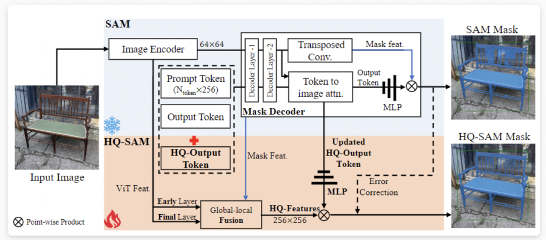 HQ-SAM: HQ-SAM 为了实现高质量的掩膜预测,将 HQ-Output Token(高质量输出标记)和全局-局部特征融合引入到SAM中。为了保持SAM的零样本能力,轻量级的 HQ-Output Token 复用了 SAM 的掩膜解码器,并生成了新的 MLP(多层感知器)层来执行与融合后的 HQ-Features(高质量特征)的逐点乘积。在训练期间,将预训练的 SAM 的模型参数固定,只有 HQ-SAM 中的少数可学习参数可以进行训练。