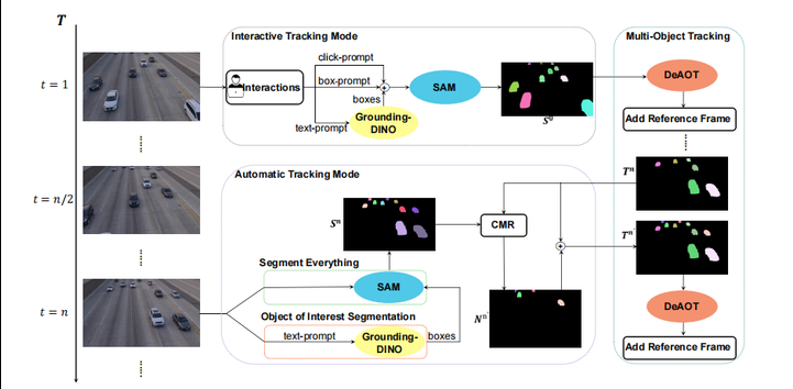 SAM 在跟踪任务方面的应用集中在通过视频中的帧跟踪和分割任意对象,通常被称为视频对象分割(VOS)。这个任务涉及在一般场景中识别和追踪感兴趣的区域。以下总结下 SAM 在跟踪方面的一些主要应用和方法: