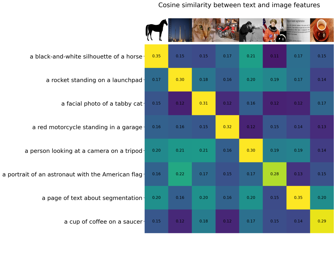 这里 表示温度系数。因此我们可以将 简单表示为 . 可以看出, 本质上还是在计算图像与文本之间的相似度得分,比如常见的余弦相似性。
