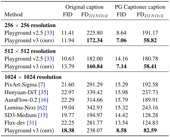 从图中,本文模型在短 Prompt 和长 Prompt 中都取得了很好的性能,并且在 FD Dinov2 中显示出显著的改进,这表明几何和对象形状要好得多。作者只与 SoTA 开源模型进行比较,因为此评估需要从 PG Captioner 中采样原始标题和标题的 30k 图像。从结果中可以看到 PGv3 在两个标题集上都取得了最好的 FID 和 FD DINOv2。值得注意的是,使用 PG Captioner 字幕,本文的 1024px 模型显着优于 Flux-dev,表明颜色和形状泛化方面图像质量很强。