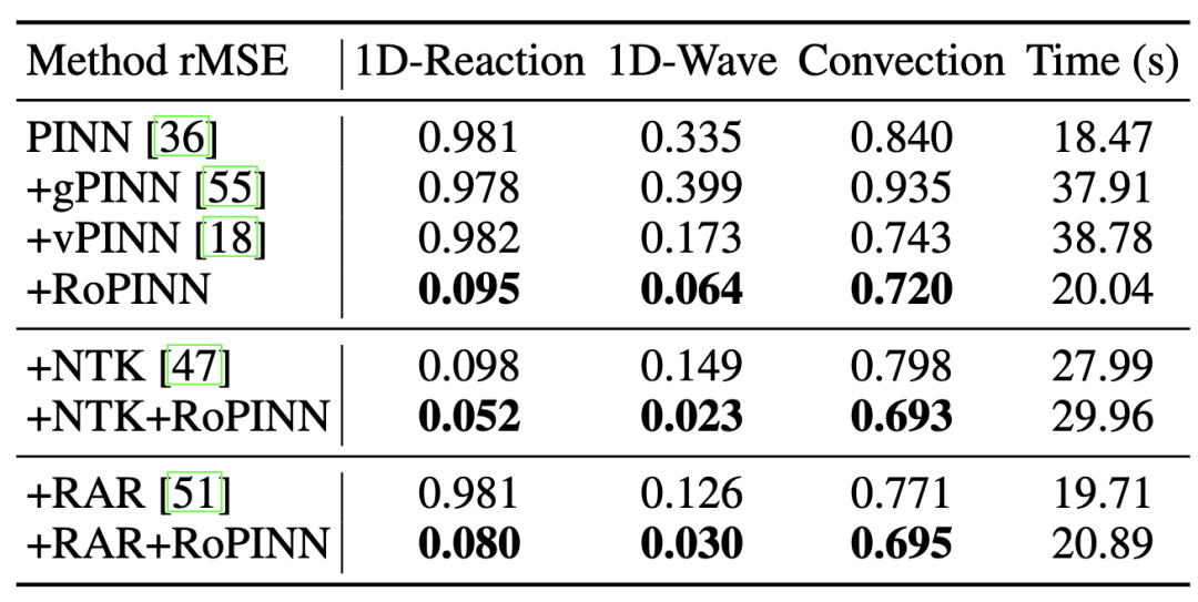 因为RoPINN关注损失函数的定义,与前人提出的采样方法、损失函数加权方法贡献正交。如上图所示,RoPINN也可以与上述方法结合使用,以得到进一步效果提升,同时也保持了算法的计算效率。