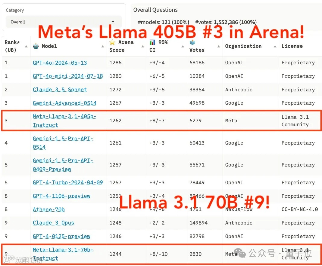 与此同时,大模型竞技场排名更新,Llama-3.1-405B代表开源模型首次跻身竞技场前三,仅次于GPT-4o和Claude-3.5-Sonnet。