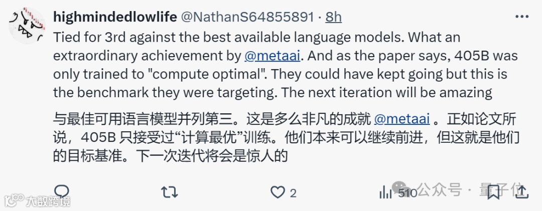 不过最令人惊喜的是,与此同时,国外网友也对405B的新战绩发来贺电,更有人“贴心”提醒: