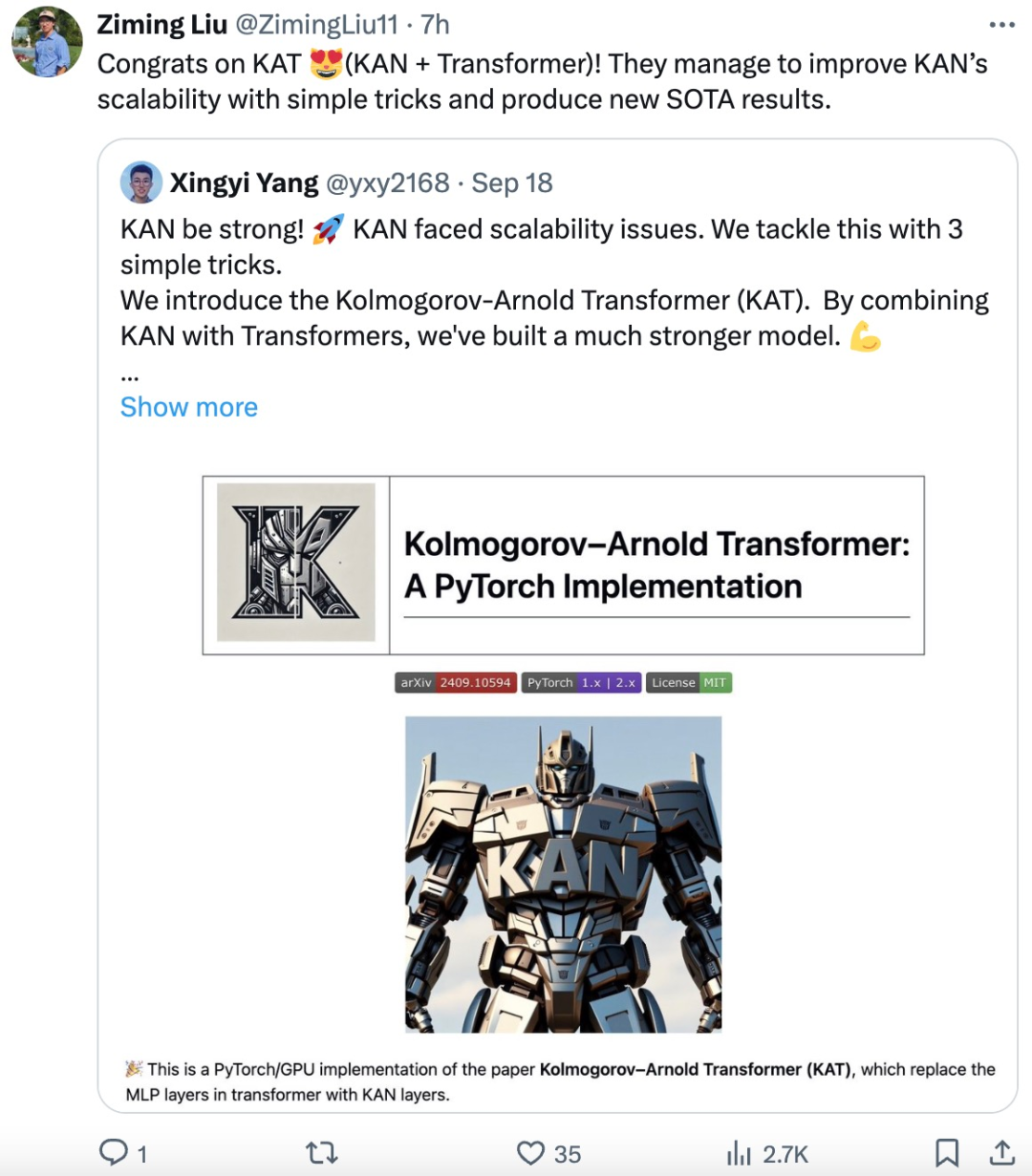 KAN 原论文第一作者 Ziming Liu 也转发点赞了这项新研究。