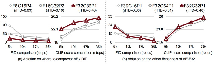 作者对比了 AE-F32 中的不同 Channel 数:最后选择 作为设置。如图 3(b) 所示, 更少的通道更快地收玫, 但重建质量更差。在 35 K 训练步骤后, 和 的收敛速度相似;然而, 产生更好的重建指标, 从而获得更好的 FID 和 CLIP 分数。尽管 C=64 提供了优越的重建, 但其以下 DiT 的训练收玫速度明显慢于 。