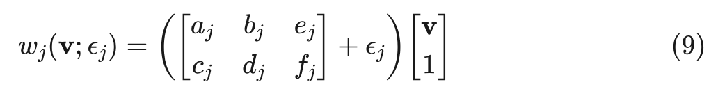 其中 是预定义的二维仿射变换, 里面的参数从均匀分布 中采样生成。 是从候选数中随机抽样得到的数, 决定当前 IFS 的仿射变换数量。 是一个根据 计算的概率质量分布, 和为 1 , 代表 被抽到的概率。 定义为